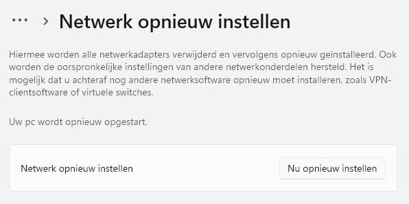Voor een ingrijpender troubleshooten ga je in Windows naar Instellingen / Netwerk en internet, open je Geavanceerde netwerkinstellingen en selecteer je Netwerk opnieuw instellen. Bevestig met Nu opnieuw instellen, maar gebruik dit alleen als andere opties niets opleveren!