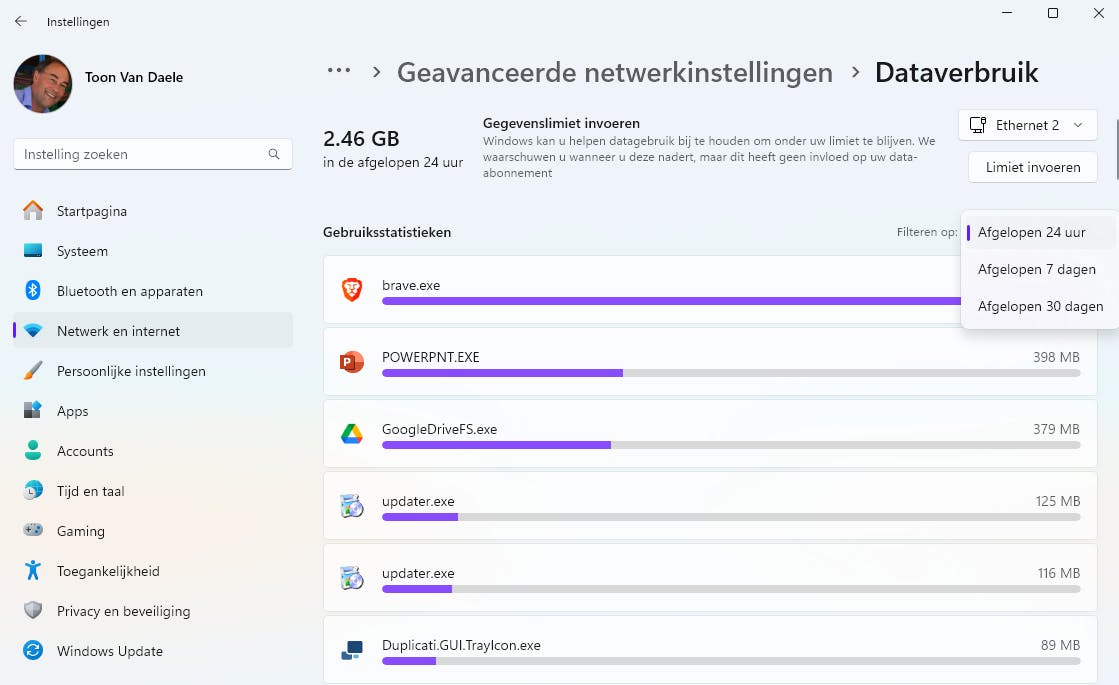 Voor meer details installeer je de gratis tool NetworkUsageView. Hiermee zie je per applicatie, netwerkadapter en gebruiker het dataverbruik, gebaseerd op door Windows opgeslagen data.