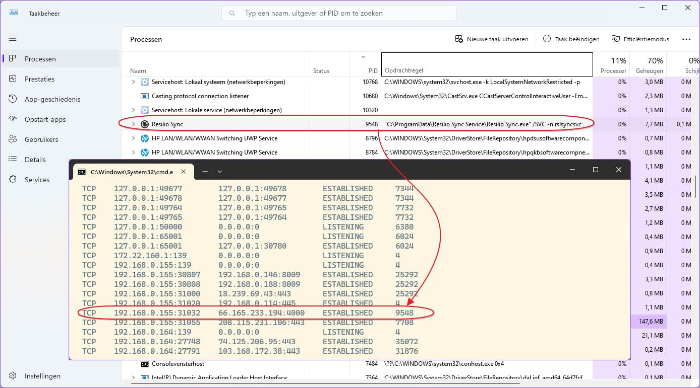 Het Taakbeheer vertelt je welke proces achter een bepaalde netwerkverbinding schuilt.