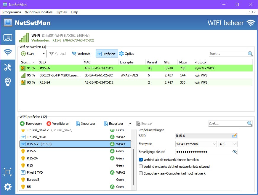 Werk je met je laptop geregeld op verschillende locaties thuis of op je werk, dan kan NetSetMan handig zijn. Je kunt namelijk allerlei netwerkinstellingen in netwerkprofielen opslaan, zoals gateway, DNS-server, printer en wifi-profiel. De wifi-profielen kun je bekijken, aanpassen en zelf maken via de knop WIFI beheer, waar je Profielen selecteert. Klik je hier op Scan, dan krijg je bovendien een overzicht van de gedetecteerde draadloze netwerken, inclusief signaalsterkte, SSID, MAC-adres, kanaal, snelheid, protocol en gebruikte encryptie.