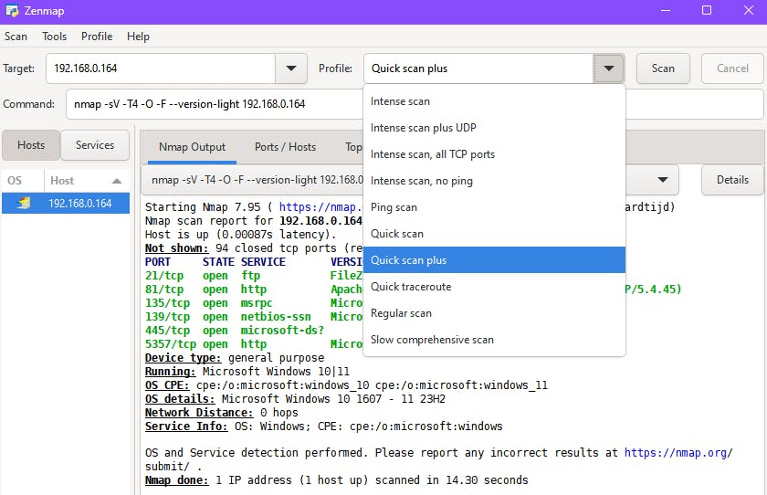 Deze scan is binnen de seconde afgerond. Voor een grondigere controle kies je Intense scan, wat dit commando oplevert: