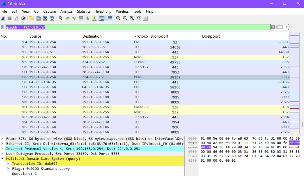 De opgevangen datapakketjes worden onder elkaar getoond, inclusief het gebruikte protocol en de betrokken hosts.