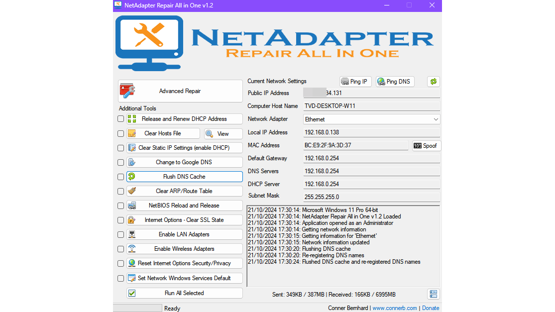 Naast de ingebouwde Windows-opdrachtregelcommando’s en de functies bij Netwerk en internet in de Instellingen van Windows, zijn er ook externe tools die helpen bij het oplossen van netwerkproblemen. Eén ervan is NetAdapter Repair All In One. Hoewel wat ouder, werkt deze nog prima onder Windows 11. De tool focust op het herstellen van foutieve of inefficiënte netwerkinstellingen, of een netwerkadapter die niet goed functioneert. Voer de tool bij voorkeur als administrator uit. Hij biedt zo’n vijftien knoppen voor specifieke herstelacties, zoals het legen van het hosts-bestand, opschonen van de DNS- of ARP-cache, vernieuwen van de DHCP-lease, wisselen van DNS, en resetten van fysieke netwerkadapters of wifi-adapters.
