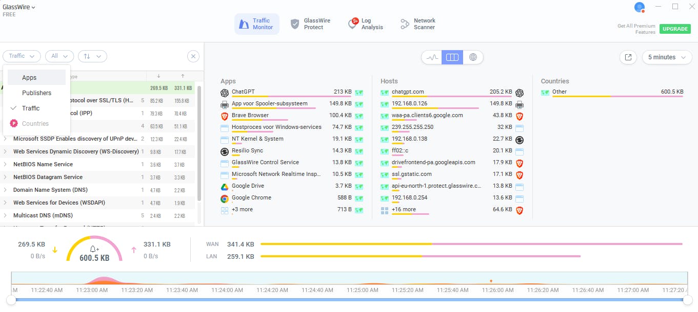 Linksboven vind je een filterknop waarmee je de data kunt filteren op bijvoorbeeld Apps, Publishers (de bedrijven achter de apps) en Traffic (specifieke netwerkprotocollen). Met de knop All kun je de data beperken tot het interne netwerkverkeer (LAN) of verkeer van en naar internet (WAN). Het pijltje ernaast laat je inzoomen op binnenkomende, uitgaande of beide verkeersstromen.