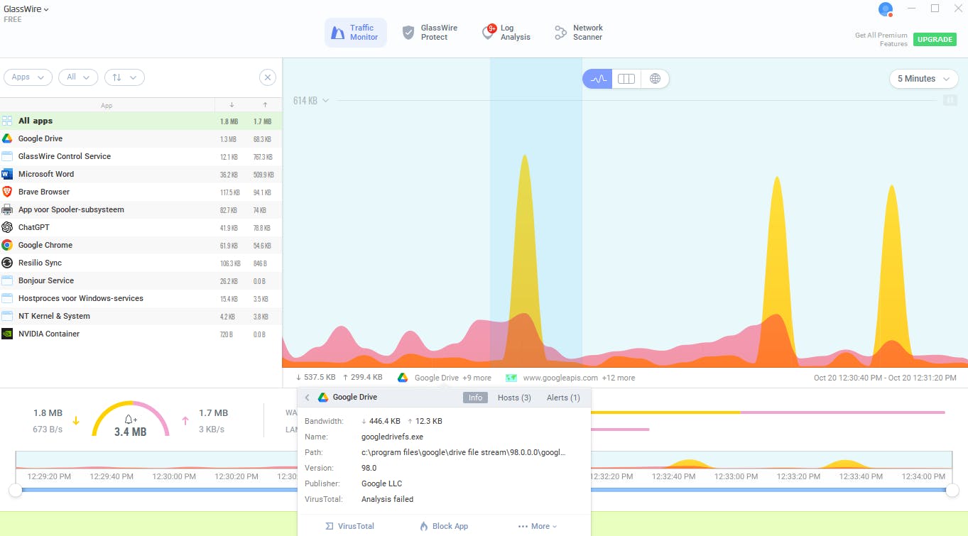 GlassWire toont het actuele netwerkverkeer live in een grafiek.