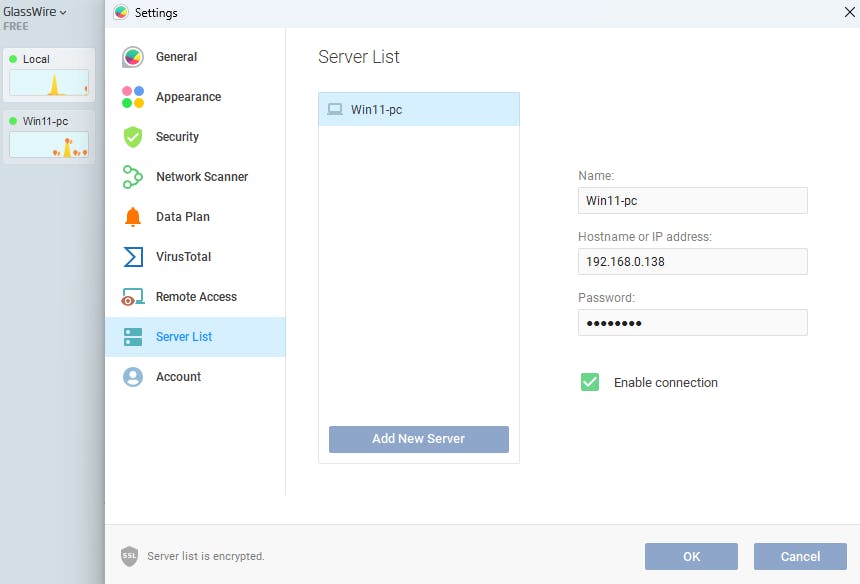 Op je eigen pc ga je ook naar Settings en selecteer je Server List. Klik op Add New Server, voeg het ip-adres en eventuele wachtwoord van de andere pc toe. Geef deze een naam en vink Enable connection aan. Bevestig met OK. De remote-pc verschijnt nu links in het hoofdvenster van GlassWire. Vergeet niet om de betreffende poort (standaard 7010) in je firewall of router open te zetten als dat nodig blijkt.