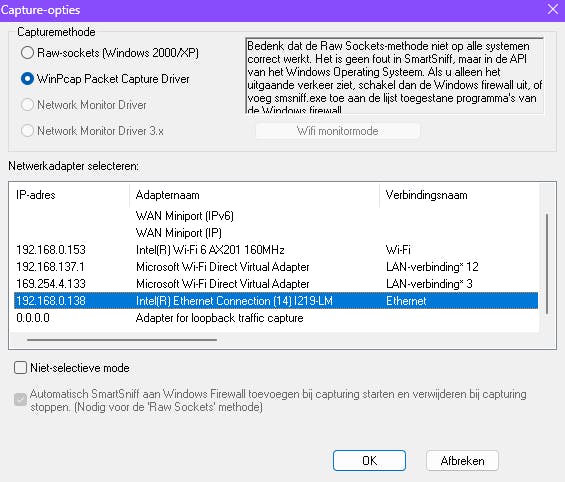 Voordat je SmartSniff opstart, installeer je ook Npcap. Dit zorgt er namelijk voor dat SmartSniff directe toegang heeft tot netwerkpakketten van zowel bekabelde als draadloze netwerken, en deze in realtime kan vastleggen en weergeven. Ook lokale verkeer, het zogeheten ‘loopback-verkeer’, kun je hiermee monitoren.