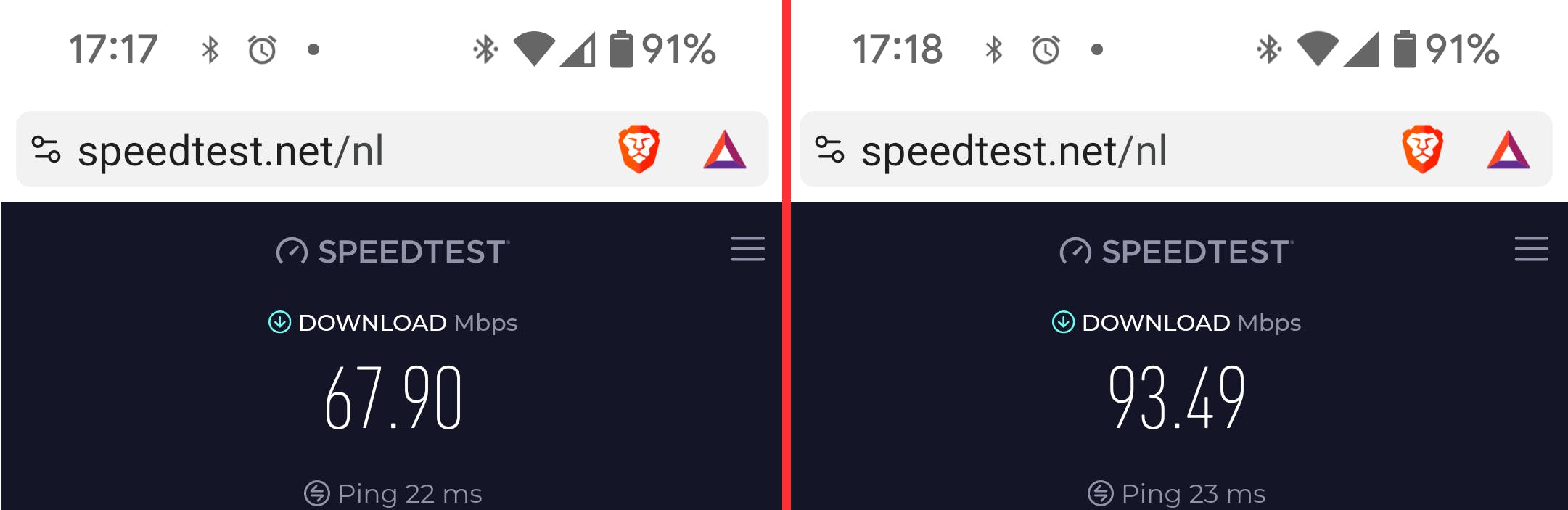 Dezelfde internetverbinding (gemeten op een smartphone), links via wifi 4, rechts via wifi 6.