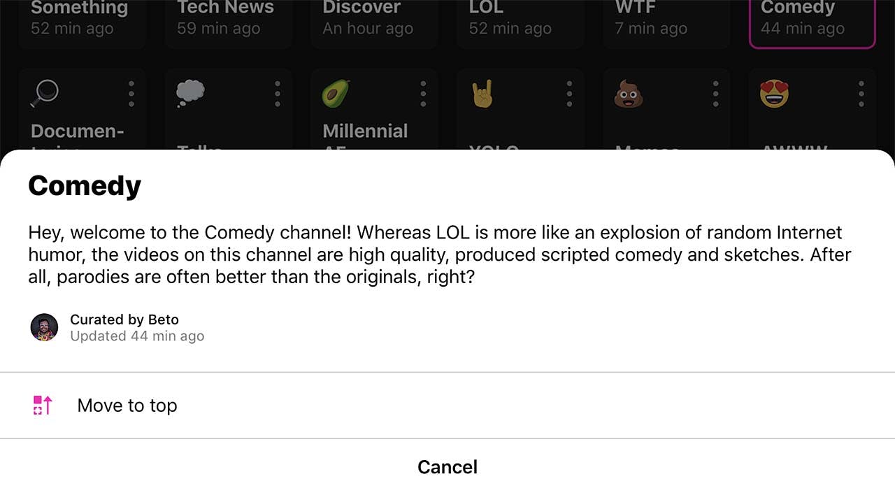 Ben je even uitgekeken op je standaard ingestelde categorieën, dan tik je simpelweg op een van de andere in het overzicht onder de lopende clip. Ook is het mogelijk om achteraf je standaardselectie te wijzigen. Tik daarvoor op bij een categorie op de drie puntjes rechtsboven het bijbehorende pictogram. Kies dan de optie Move to top en dit is voortaan de eerste categorie die afgespeeld wordt. Via een tik op het poppetje linksonder in beeld zijn nog wat andere zaken in te stellen. Zo schakel je hier bijvoorbeeld notificaties (meldingen) aan of uit. En is het mogelijk om verschillende apparaten te syncen of back-uppen qua Neverthink-settings. Daarvoor is het echter wel nodig eerst een account aan te maken.