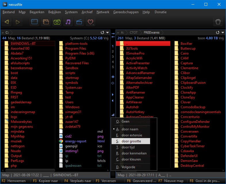 Het programmavenster van NexusFile oogt best fraai, met kleurrijke tekst en pictogrammen op een donkere achtergrond. Helemaal onderaan vind je een functiebalk, net zoals bij Total Commander. Het valt meteen op dat de app standaard twee navigatievensters naast elkaar toont, wat operaties als kopiëren en verplaatsen een stuk handiger maakt. Maar er zijn nog heel wat andere handigheden en functies.