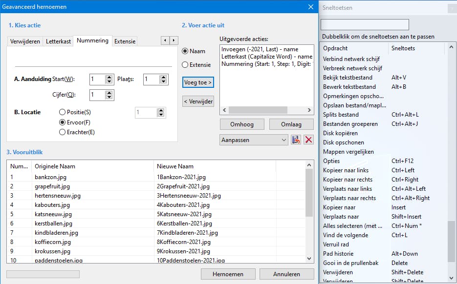 Vanuit de menubalk kun je bovendien allerlei operaties op je bestandselecties doorvoeren, zoals het grondig verwijderen door de data te ‘shredden’, of het in batch hernoemen van bestanden op basis van geavanceerde criteria, inclusief voorafbeelding. In tegenstelling tot Verkenner ben je hier niet beperkt tot het archiveren in zip-bestanden, want ook rar, 7z, alz en arj worden ondersteund. Er is verder ook een tool beschikbaar om twee mappen met elkaar te vergelijken. Heel veel mogelijkheden dus en de meeste laten zich bovendien met – aanpasbare – sneltoetsen aansturen. Met een druk op F12 krijg je die allemaal te zien (we telden er meer dan 130).