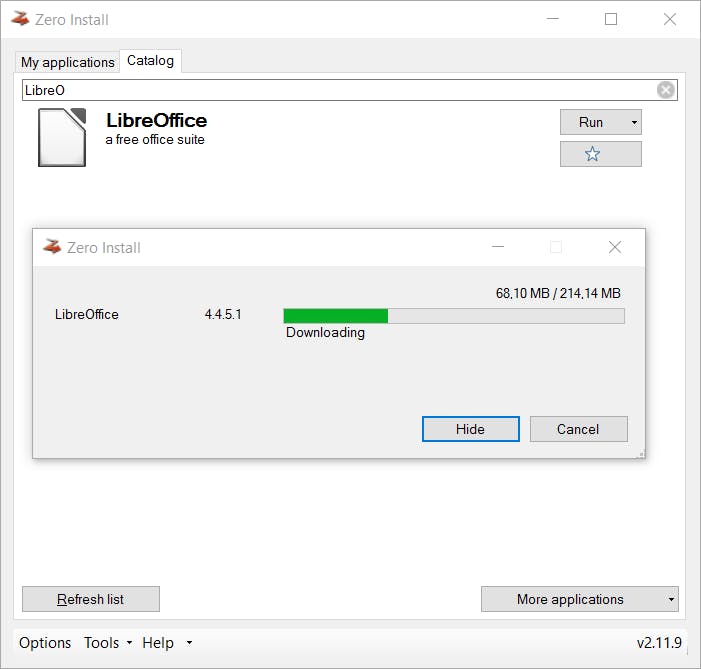 Zero Install geeft je de mogelijkheid om eenvoudig draagbare software binnen te halen en uit te voeren. Er is dan geen installatie vereist. Het programma heeft een bibliotheek van ongeveer 80 programma’s die je met een druk op de knop kunt starten. Het voordeel is dat programma’s dan geen beheerderstoegang vereisen, dat alle afhankelijkheden al aanwezig zijn en dat Zero Install je programma’s automatisch up-to-date houdt. Bovendien kun je eenvoudig kiezen welke versie je graag wilt gebruiken - voor als de nieuwste versie een functie mist of een ernstig probleem bevat. Ook kun je zonder zorgen een testversie uitproberen, gezien het toch geen effect heeft op de rest van je systeem. Enkele van de programma’s die Zero Install ondersteunt, zijn FileZilla, Mozilla Firefox, Sublime Text, VLC, Blender, Audacity, KeePass en ook LibreOffice.