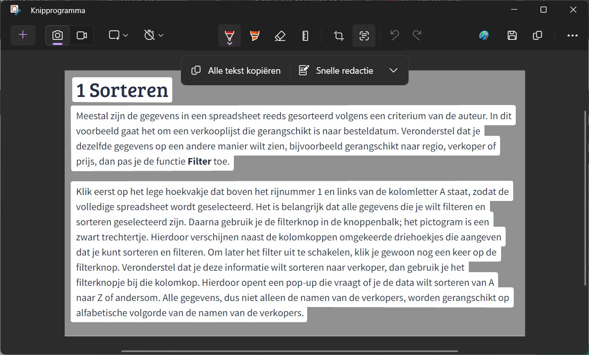 Update 23H2 voor Windows 11 voegt een nieuwe OCR-engine (optische tekstherkenning) toe aan het standaard programma waarmee je schermafbeeldingen maakt. Wanneer je bijvoorbeeld een webpagina opent en je drukt op Windows-toets+Shift+S om het Knipprogramma te openen, dan gebruik je nog steeds de knop Nieuw om een foto te nemen van het hele scherm, het actieve venster of een bepaalde zone op het scherm. Als je het resultaat in het programma bekijkt, dan zul je een nieuwe knop zien: Tekstacties. Door hierop te klikken, start de tekstherkenning van het systeem en zal het Knipprogramma alle tekst selecteren. Bovenaan staat een nieuwe knop: Alle tekst kopiëren. Gebruik die om de geselecteerde tekst te kopiëren, zodat je deze bijvoorbeeld in een tekstverwerker kunt plakken.