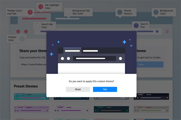 Druk op Save om je zelfgemaakte thema te bewaren voor later. Zo kun je meerdere kleurschema's opslaan, bijvoorbeeld een lichte voor overdag en een donkere voor 's avonds. Mocht je een thema-url van een andere gebruiker krijgen of vinden, voer die dan simpelweg in je adresbalk in en druk op enter. Firefox vraagt ter bevestiging of je het thema wilt installeren. Kies hier de optie Yep.