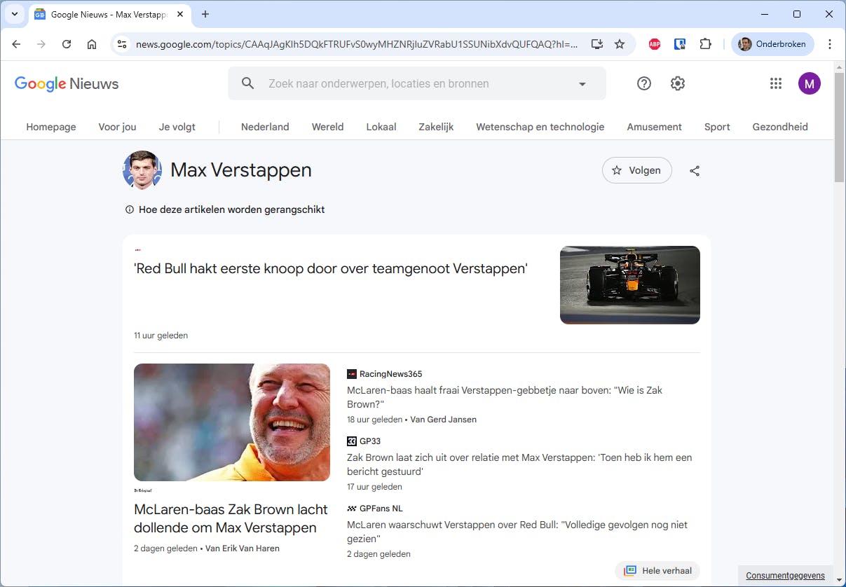 Of je het nou leuk vindt of niet: BN’ers domineren tegenwoordig het nieuws in de landelijke media. Je kunt dan ook acteurs, presentatoren en professionele sporters aan je interesselijstje van Google Nieuws toevoegen. Typ in het zoekveld bijvoorbeeld Max Verstappen en druk op Enter. Klik daarna op Volgen. Naast bekende Nederlanders kun je ook buitenlandse beroemdheden toevoegen.