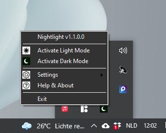 Je vindt het Nightlight-pictogram in het systeemvak van het Windows-bureaublad. Door op het schakelaartje met de linkermuisknop te klikken, ga je naar de donkere modus en verschijnt er een maan-pictogram. De donkere modus wordt onmiddellijk toegepast en je zult zien dat ook alle Windows-apps donker zijn geworden. Klik nog een keer op dezelfde knop om naar de lichte modus te gaan en het zon-pictogram te zien.