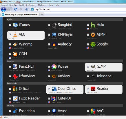 Het softwareaanbod van Ninite is helaas (nog) niet zo heel uitgebreid, maar wel goed gekozen en geordend in logische categorieën. De bekendste gratis en opensource programma’s zijn allemaal van de partij: de browsers Firefox, Chrome, Safari en Opera, maar ook communicatieprogramma’s zoals Skype, Windows Live Messenger en Pidgin, mediaspelers zoals iTunes, Songbird, Winamp en VLC, het kantoorpakket OpenOffice.org en een trialversie van Microsoft Office 2007. Ook essentiële runtimes zoals Java, Flash, .NET en Silverlight kunt u aanvinken, evenals beveiligingsprogramma’s en andere tools.
