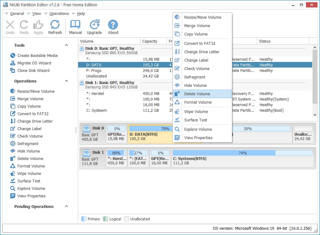 Wie al eerder met externe partitiebeheerders aan de slag is gegaan, zal zich onmiddellijk thuis voelen in de (grafische) interface van deze tool: links de beschikbare tools en functies, rechtsboven een tekstueel partitieoverzicht en daaronder een grafische weergave. Het functieaanbod maakt indruk. Je kunt volumes niet alleen verwijderen, formatteren en hernoemen, maar bijvoorbeeld ook schalen, kopiëren, samensmelten, controleren, wipen en defragmenteren. Verder tref je hier een paar conversietools, zoals omzettingen naar fat32 of naar gpt. NIUBI Partition Editor komt bovendien van pas als je een besturingssysteem wilt migreren of klonen; een wizard loodst je dan door de verschillende fasen. Alles bij elkaar dus duidelijk meer dan bij het Windows Schijfbeheer en dan bij de meeste andere gratis partitiebeheerders. Niet alleen méér overigens: het viel ons ook op dat de meeste operaties opvallend snel verliepen.