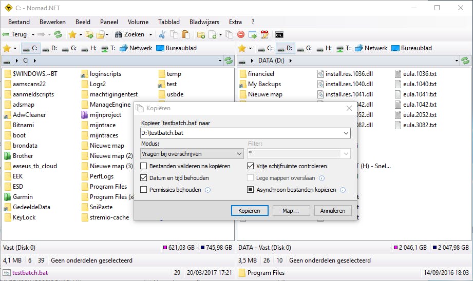 De voordelen van zo’n tweevoudig paneel worden al snel duidelijk wanneer je bestanden of mappen moet kopiëren. Je versleept die simpelweg van het ene naar het andere paneel. Voor verplaatsen in plaats van kopiëren houd je de rechtermuisknop ingedrukt tijdens het verslepen. Bij een kopieer-actie duikt een venster op waarin je bestanden na het kopiëren kunt laten valideren, kunt aangeven of je de bestaande machtigingen wilt behouden en of je het kopieerproces al dan niet asynchroon wilt laten verlopen. Dat laatste gaat sneller omdat de tool dan tegelijk data kan wegschrijven en alvast andere data kan inlezen.