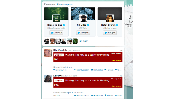 Wanneer je de woorden hebt toegevoegd waarvan je geen spoilers wilt ontvangen, ben je klaar om internet te bestormen. Ter illustratie duiken we op Twitter en zoeken we naar Breaking Bad, een woordencombinatie die we hebben toegevoegd aan de triggerlijst. Je krijgt direct het effect te zien: bovenin staat een waarschuwing dat deze pagina wellicht spoilers bevat. Ook op de onderdelen die spoilers bevatten, staat een groot rood vlak.