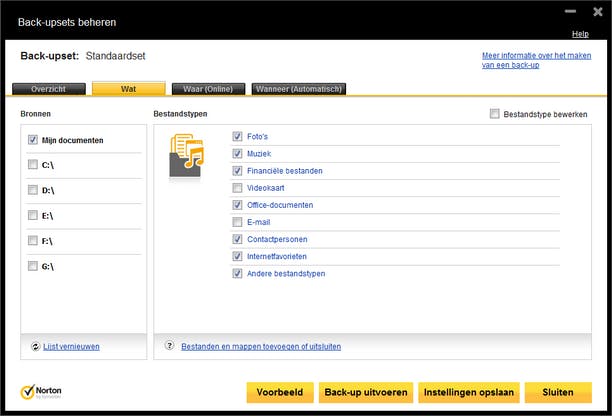De installatie verloopt vlekkeloos en snel, zoals we dat de laatste jaren van Norton-producten gewend zijn. Wat opvalt, is dat de software niet direct een malwarescan uitvoert: een melding dat het systeem wel of niet schoon is, wordt namelijk niet gegeven. Een andere vernieuwing in het product is de verbeterde back-up. Deze is erg gebruiksvriendelijk. De vraag is echter of u het product vertrouwt, want het programma maakt namelijk niet duidelijk welke bestanden precies worden geback-upt, wanneer en waarheen. Norton 360 verstopt deze essentiële informatie meer dan noodzakelijk en verantwoord is. Behalve opslaan naar cd, dvd of externe harde schijf is er ook 2 GB online opslagruimte beschikbaar. Voor drie pc's erg weinig. Wilt u meer opslagruimte, dan is de Premier Edition van Norton 360 het overwegen waard. Voor een meerprijs van tien euro krijgt u dan 25 GB opslagruimte voor maximaal drie pc's.