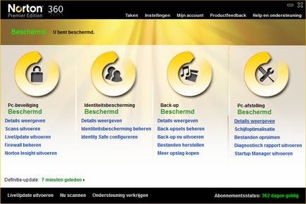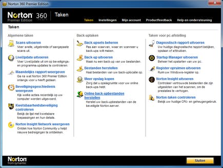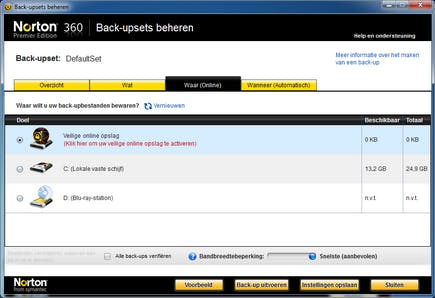 Voor back-up levert Norton een abonnement op de eigen online back-updienst mee. Bij de standaardversie van Norton 360 krijgt u daar 2 GB online opslagruimte, bij de Premier Edition 25 GB. U kunt zelf regelen wanneer u iets wilt back-uppen en waarheen, maar automatisch gebeurt dit online zodra de pc inactief is. Nieuw is de webtoegang waarmee het mogelijk is via internet toegang te krijgen tot de back-up en van afstand bestanden terug te zetten. Over deze nieuwe functie is in de handleiding echter niets te vinden.