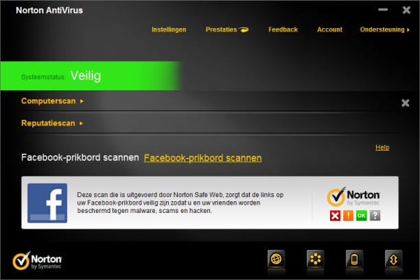 Het is bovendien niet de enige rariteit in de interface van de beide programma's. Zo leidt de knop Nu scannen niet naar de systeemscan maar naar de reputatiescan en de nieuwe Facebook-prikbordscanner. De eerste scant bestanden op basis van feedback van andere Norton-gebruikers, de tweede doorzoekt berichten op de eigen Facebook-pagina op malafide url's. Niet wat je zoekt als je 'nu' je systeem wilt scannen. De Facebook-prikbordscanner vereist daarbij behalve lees- ook schrijfrechten op de Facebook-pagina. Volgens Homayoun Sarkechik van Symantec gebruikt het die om een eventuele gevonden malafide url te melden op de Facebook-pagina, het product zal verder geen foto's of reclameberichten plaatsen.