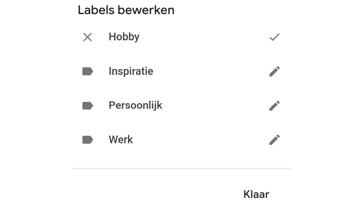 Labels zijn onmisbaar om je notities geordend te houden. Links in het venster vind je de optie Labels bewerken. Bovenin kun je een nieuw label maken. Standaard kent Google Keep al een aantal labels die je via het pictogram met de pen kunt bewerken. De labels verschijnen links in het menu van het hoofdvenster. Klik op een label om de bijbehorende notities te tonen. Afhankelijk van de hoeveelheid notities kan de standaardweergave van Keep minder overzichtelijk worden. Dit verbeter je via een klik op Lijstweergave: de knop hiervoor vind je rechtsboven in het venster.