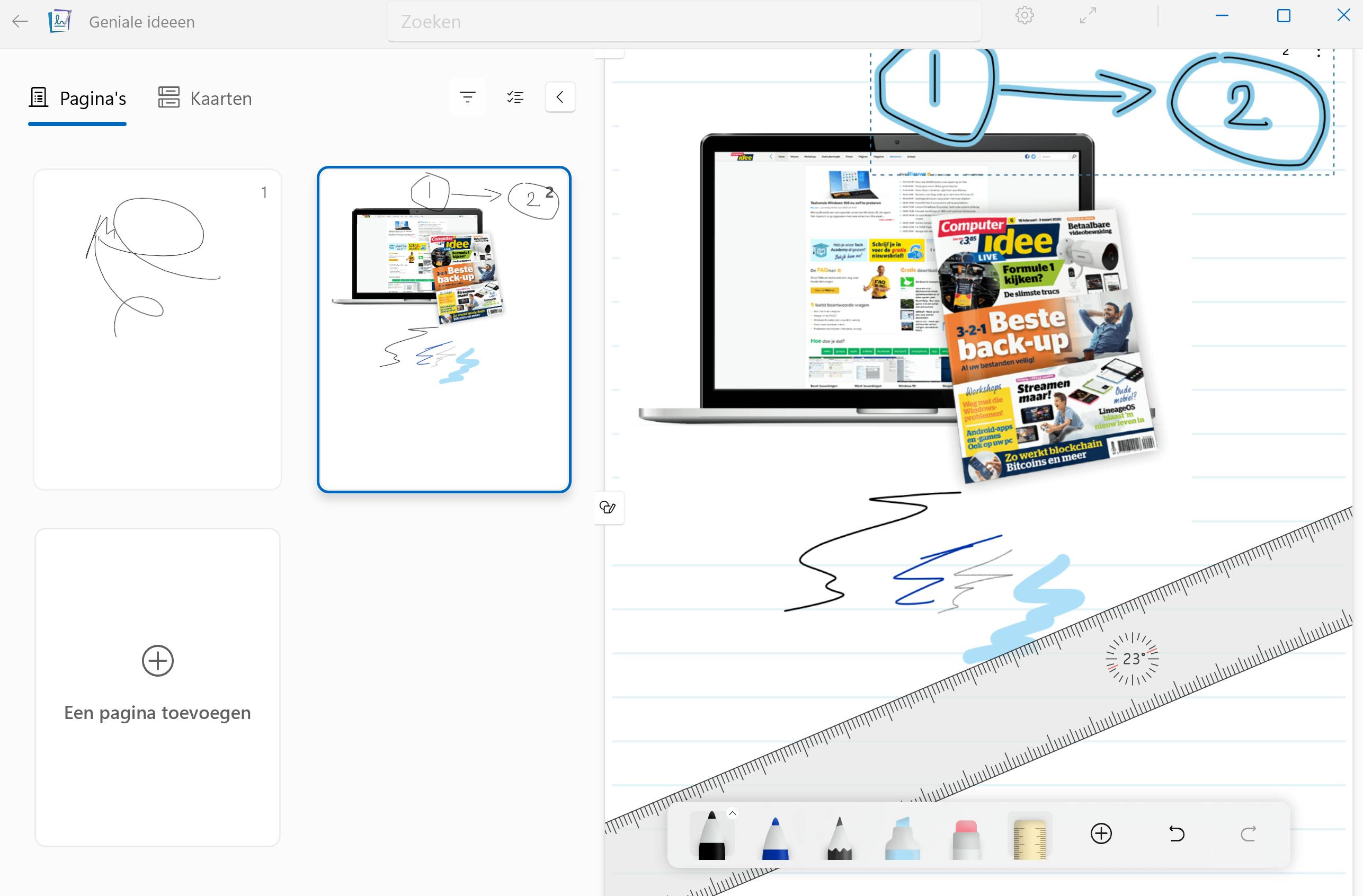 Links in het venster vind je een overzicht van de gemaakte pagina’s. Is de balk niet zichtbaar, klik dan op het pijltje om de sectie uit te klappen. Kies voor Een pagina toevoegen om een nieuwe pagina te maken. Klik op Kaarten om je logboeken in een compacte weergave te tonen. Onderin vind je een werkbalk waar je uit verschillende pennen en potloden kunt kiezen. Ook is er een liniaal aanwezig. Om te voorkomen dat de computer uitschakelt als je al even niets hebt geschreven, kun je via Microsoft Logboek afdwingen dat de computer altijd blijft ingeschakeld. Klik op de knop Instellingen (herkenbaar aan het tandwiel, rechtsboven in het venster) en ga naar Beeldscherm en weergave. Zet de schuif op Aan bij Apparaat actief houden.
