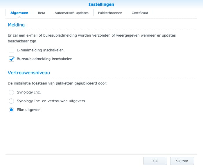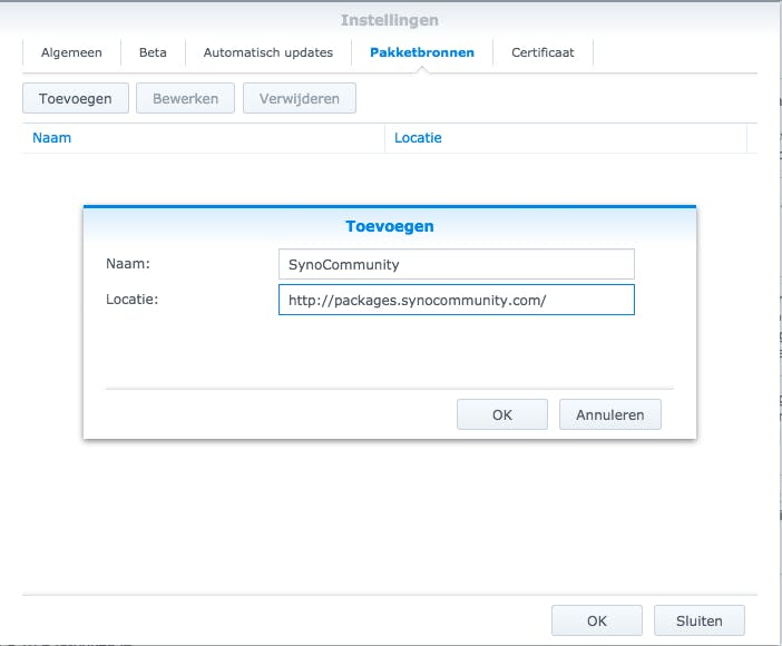 Om de SynoCommunity-pakketbron toe te voegen, doorloop je de volgende stappen. Ga naar DSM en klik in het hoofdscherm op Package Center. Klik bovenaan op de knop Instellingen en kies voor het tabblad Pakketbronnen. Klik op de knop Toevoegen. Vul bij Naam de naam in: SynoCommunity en bij Locatie de volgende link: http://packages.synocommunity.com/. Klik op OK. Er verschijnt een melding over het vertrouwen van het certificaat, klik opnieuw op OK om door te gaan. Ga in het Instellingenscherm nog even naar het tabblad Algemeen. Onderaan vind je de sectie Vertrouwensniveau. Deze kun je het beste wijzigen naar Synology Inc. en vertrouwde uitgevers. Mocht je een pakket tegenkomen dat je graag wilt installeren, maar dat niet vertrouwd is, zet het niveau dan later op Elke uitgever. Let wel op dat je dan mogelijk risico loopt, omdat je niet-vertrouwde software installeert. Klik ten slotte op OK om het Instellingenscherm te sluiten.