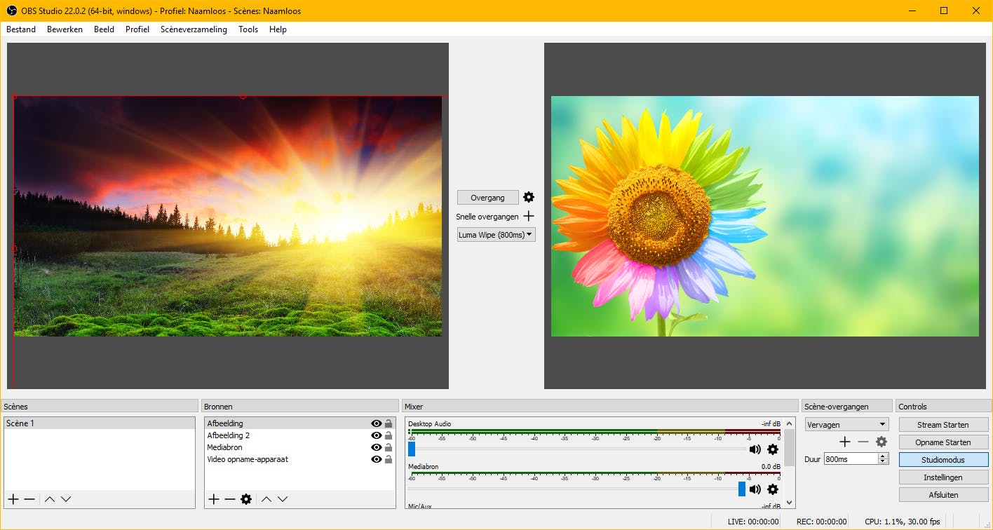 Grofweg werkt OBS met twee onderdelen: scènes en bronnen. Scènes zijn letterlijk scènes die je maakt voor je video, die zijn opgebouwd uit bronnen. Die bronnen kunnen bestaan uit opgenomen video’s, een live feed van je webcam, een afbeelding, een audiobestand, een Windows-venster; noem maar op. In een scène kun je bronnen stapelen, oftewel, je kunt je webcam-feed laten afspelen bovenop een afbeelding of andere video. Stel dat je een scène maakt met een opgenomen video en een scène met een live feed, dan is ‘dan schakelen we nu weer over naar de studio’ ineens niet meer zo moeilijk. De scènes kun je voorzien van soepele overgangen, zodat het er echt uitziet alsof het in de studio gemonteerd is.
