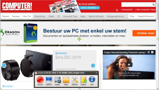 Direct na de installatie verschijnt een verplaatsbare groene rechthoek op je scherm. Deze markeert het opnamegebied en met de Record-knop op de zwevende knoppenbalk kun je direct een opname starten. De beelden bewaart oCam standaard in een avi-bestand, in de map C:\users\\ocam. Naast screencasts kan oCam via de knop Capture ook statische schermafbeeldingen maken die in het png-formaat worden bewaard.