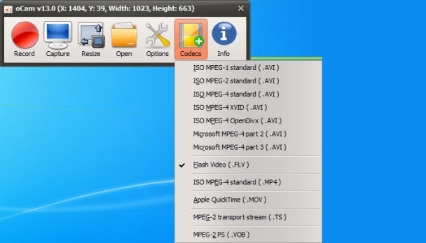Zoals gezegd slaat oCam screencasts standaard op in een avi-container, maar ook dat kun je aanpassen. De knop Codecs biedt je namelijk nog een aantal andere mogelijkheden aan: naast diverse formaten binnen de avi-container (zoals mpeg-1, mpeg-2 en mpeg-4) kun je nog mp4, flv, mov, ts en vob selecteren.
