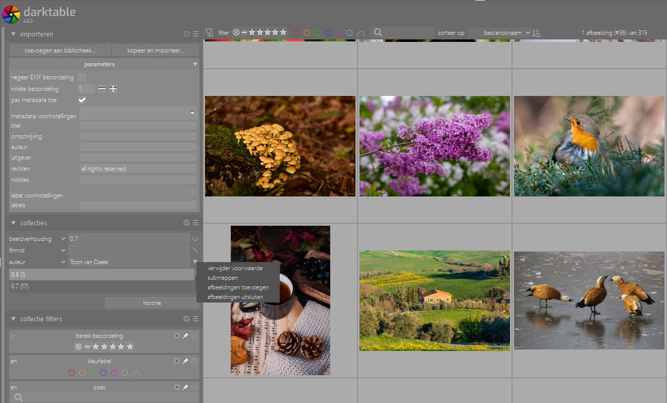 Darktable toont standaard alle foto’s uit de geselecteerde map in het linkerdeelvenster, bij collecties. Door gebruik te maken van filters kun je echter specifieke foto’s weergeven. Klik op het pijlknopje net onder collecties om uit verschillende filters te kiezen, waaronder metadata zoals label, auteur, classificatie, camera, lens en beeldverhouding. Je kunt ook filters combineren. Stel je eerste filter in, klik dan op het pijlknopje naast je ingestelde filter en kies bijvoorbeeld afbeeldingen toevoegen of afbeeldingen uitsluiten voor een volgend filter. De inclusie- of exclusiefilters kun je wijzigen door op het knopje naast een filter te klikken en opties als wijzig in <en>, wijzig in <of>, of wijzig in <behalve> te selecteren. De resultaten van je filters zie je direct in de digitale lichtbak.