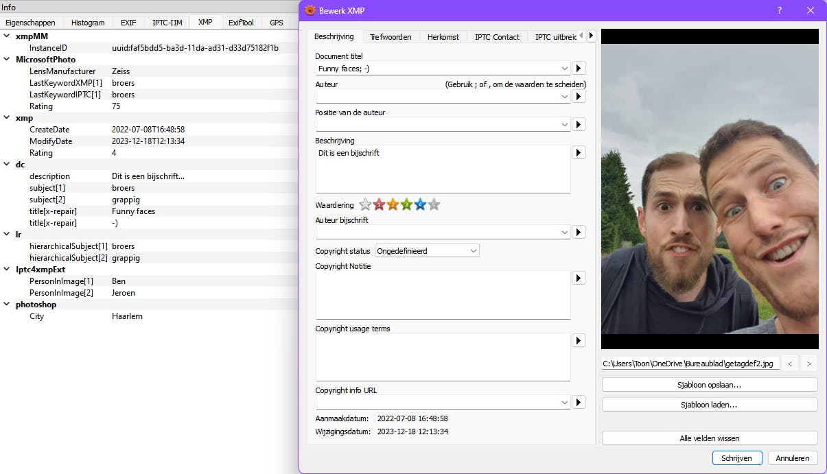 Je kunt metadata hier niet direct wijzigen, maar wel via het menu Metadata, ook voor meerdere foto’s tegelijk. Naast de optie Schoon metadata op (waar je kiest welke metadata je wilt verwijderen uit exif, xmp en/of iptc-iim), GPS-gegevens bewerken en Tijdstempel wijzigen zijn er opties zoals Edit IPTC en Edit XMP. Deze geven toegang tot diverse tabbladen met informatietypes als Bijschrift, Categorieën, Datum/tijd, Beschrijving, Herkomst, die je haast allemaal kunt wijzigen (voer je aanpassingen door met Schrijven). Gebruik de knoppen Sjabloon opslaan en Sjabloon laden als je dezelfde tags op andere foto’s wilt toepassen.