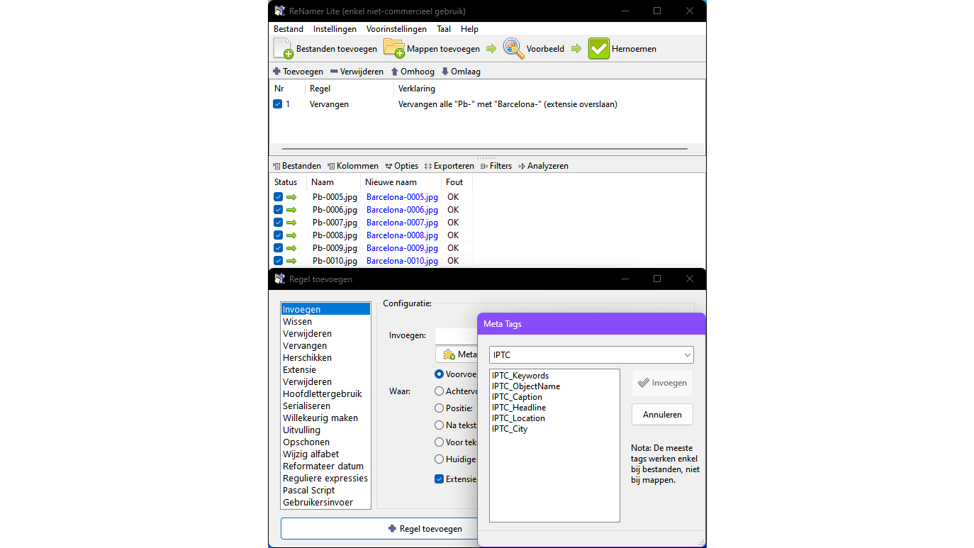 Voor het hernoemen van fotobestanden in batch is ReNamer (gratis voor niet-commercieel gebruik) een nauwkeurige en snelle optie. Voeg bestanden toe en definieer hernoemregels, zoals Verwijderen, Vervangen, Serialiseren en Invoegen. Met deze laatste kun je zelfs bestanden hernoemen op basis van exif- en iptc-metatags van je foto’s. Gebruik Voorbeeld om de naamswijziging te bekijken en voer de batchoperatie ten slotte uit met Hernoemen.