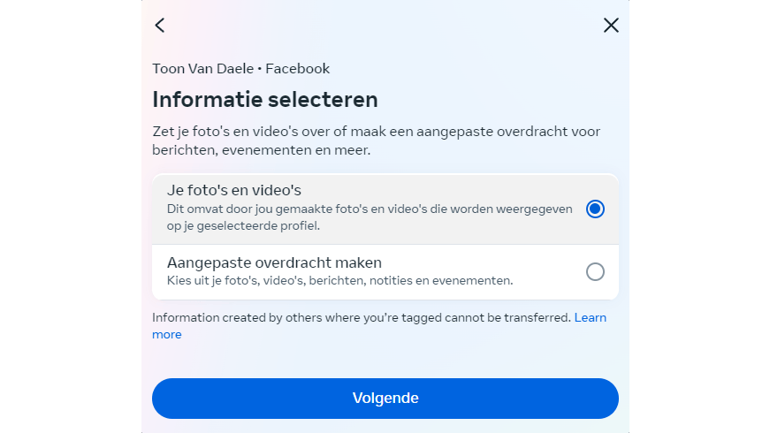 In het uitklapmenu bij Uploaden is er ook een optie Overzetten vanuit fotoverzamelingen, waarmee je foto’s van Facebook, Instagram en iCloud kunt back-uppen. Voor Facebook kan het bijvoorbeeld ook als volgt. Open je Facebook-account, ga naar Instellingen en kies Een kopie van je gegevens overzetten. Duid een profiel aan, selecteer Je foto’s en video’s evenals de bestemming, zoals Google Photos of andere diensten als Dropbox of Backblaze B2.