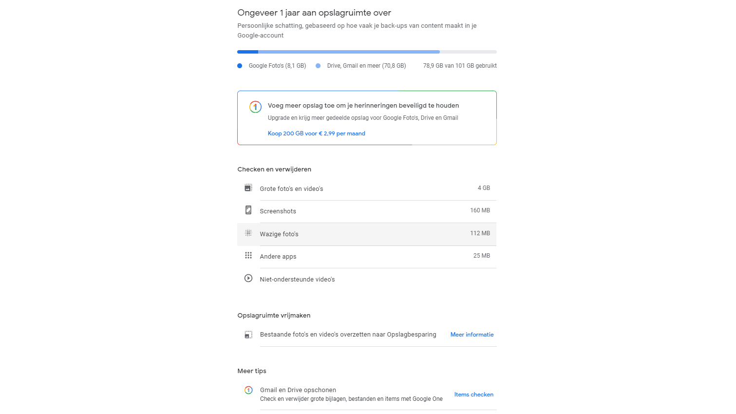 Met opties als Grote foto’s en video’s en Wazige foto’s kun je eenvoudig ongewenste bestanden verwijderen. Om meer opslagruimte te besparen, vind je in de browser de optie Bestaande foto’s en video’s overzetten naar Opslagbesparing, waarbij foto’s die in originele kwaliteit zijn opgeslagen, worden gecomprimeerd naar lagere kwaliteit. Overweeg zorgvuldig of je dit wilt, aangezien het proces onomkeerbaar is.
