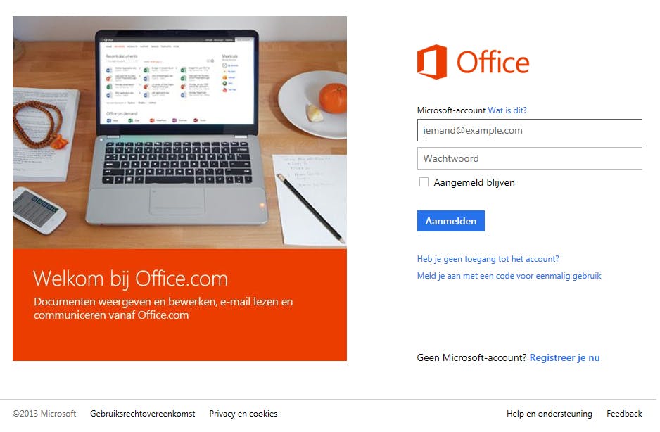 Wilt u snel toegang hebben tot uw documenten, dan kunt u niet alleen inloggen op SkyDrive maar ook op de online-omgeving van Office 365. Ga naar www.office.com en klik op Mijn Office in de horizontale menubalk helemaal bovenin beeld. Kies vervolgens in het geopende pop-up venstertje voor Microsoft-account en log in met uw Live gebruikersnaam en wachtwoord.