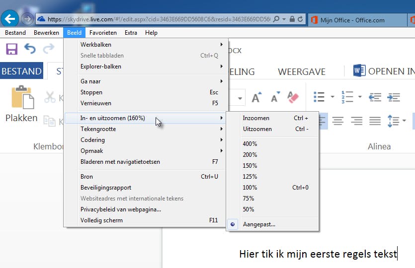 Omdat schermresoluties- en afmetingen nogal verschillen, bestaat de kans dat de Office-apps wat priegelig worden getoond in de browser. Wilt u het allemaal wat beter leesbaar, maak dan simpelweg gebruik van de zoomfunctie van uw browser. Veelal zoomt u in (of uit) door te draaien aan het muiswiel en tegelijkertijd de Control-toets ingedrukt te houden. Terug naar de standaardweergave gaan (voor als u klaar bent met de webapp) doet u door (meestal) op Control-0 (cijfer nul) te drukken. Werkt uw browser net wat anders, kijk dan even in het menu Beeld waar u de zoomfunctie ongetwijfeld aantreft.