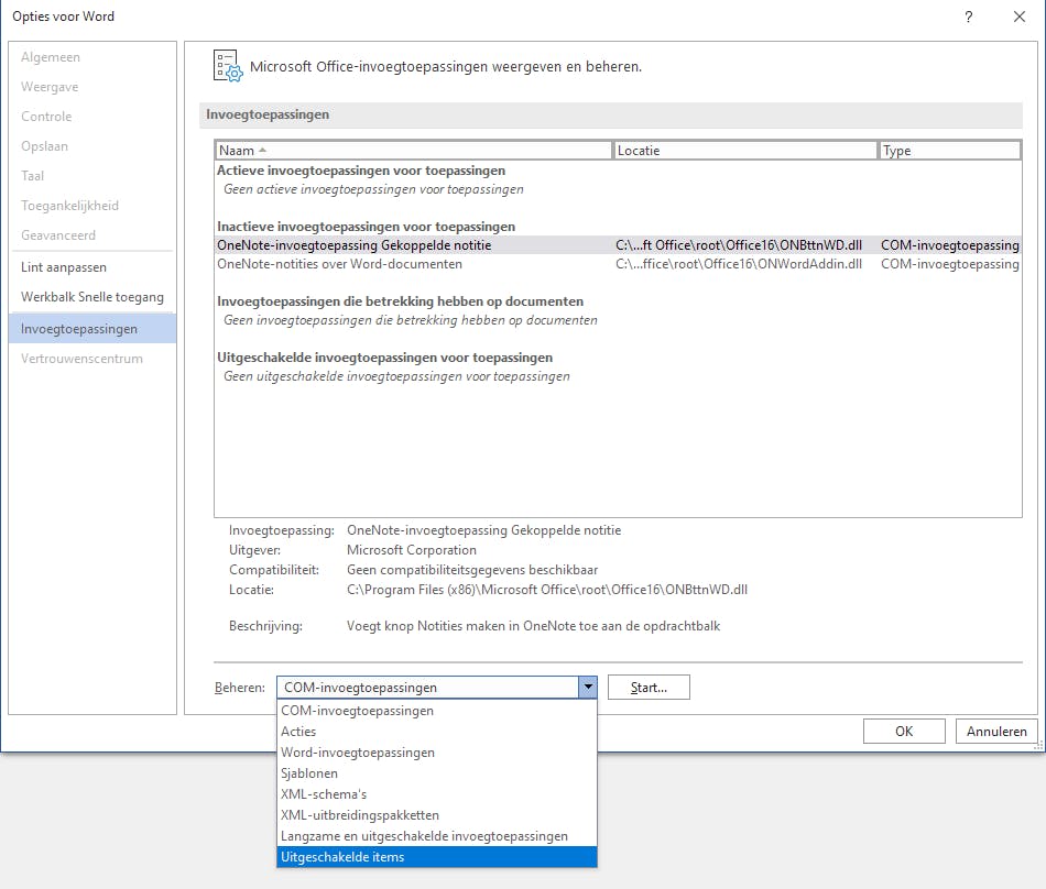Als Word, Excel of PowerPoint correct opstart in de veilige modus, dan ga je eerst na welke invoegvoegtoepassingen het programma in de normale modus zou laden. Nog steeds in de veilige modus selecteer je Bestand / Opties. In de linkerbalk kies je Invoegtoepassingen. Helemaal onderaan naast het vak Beheren selecteer je Uitgeschakelde items en daarna klik je op de knop Starten.
