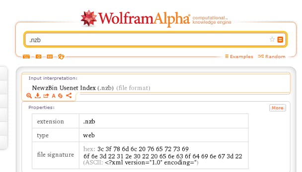 Kom je er met Google niet uit, dan is het tijd om de grootste kennisdatabase ter wereld te raadplegen: Wolfram Aplha. Het enige dat je hoeft te doen op deze site (www.wolframalpha.com) is de punt en de extensie in te vullen (je hoeft dus in dit geval niet eens 'wat is' daarbij te typen, omdat de site per definitie weet dat je op zoek bent naar de uitleg over iets. Typ je bijvoorbeeld .nzb (volgens ons voorbeeld), dan krijg je een zeer beknopt, maar efficiënt overzicht van de eigenschappen van het bestand én een lijstje met programma's waarmee je het bestand kunt openen.