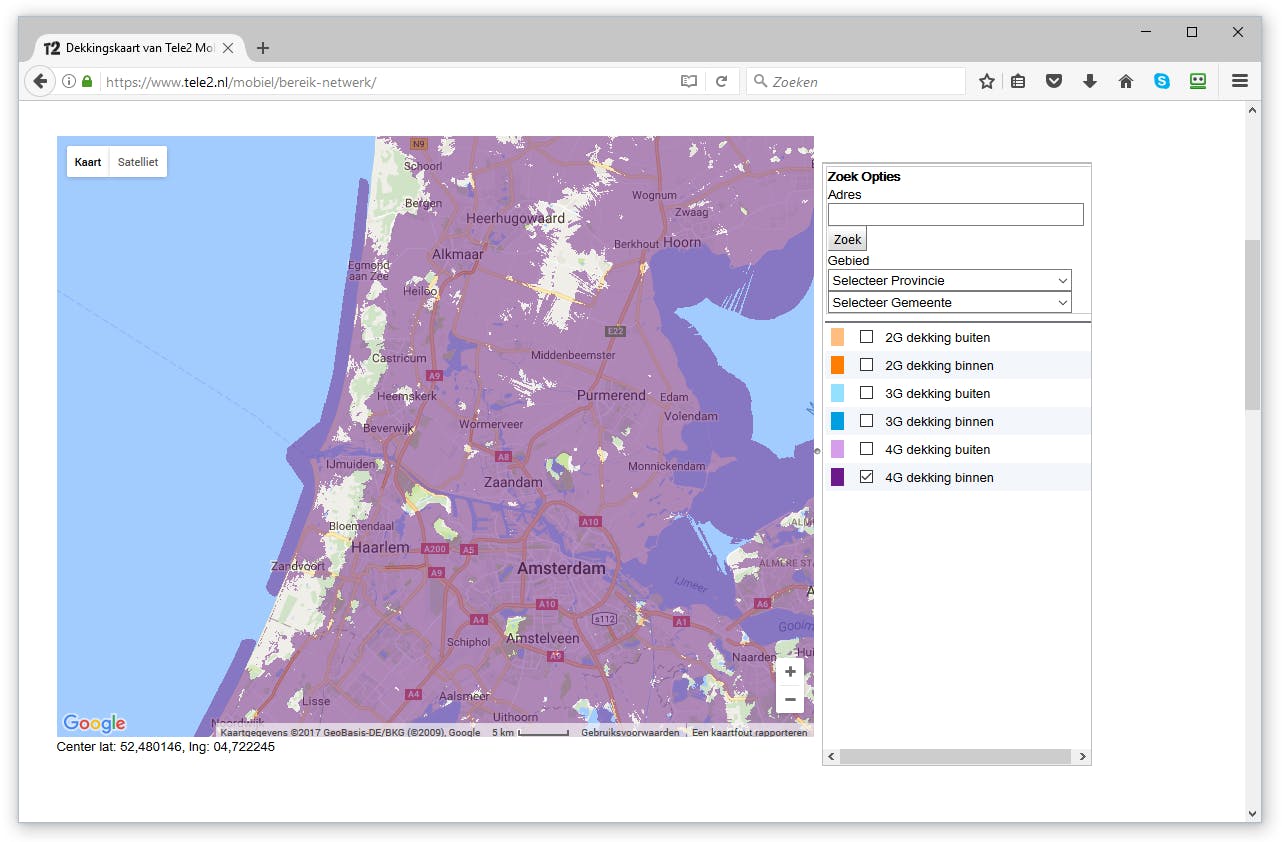 Tele2 heeft een eigen 4G-netwerk met naar eigen zeggen een landelijke dekking van 97 procent. Op plekken daarbuiten val je terug op het 3G- of 2G-netwerk van T-Mobile. Dit wordt overigens wel steeds meer ingeperkt. Zo verplicht de provider je tegenwoordig een 4G-geschikt toestel te gebruiken. Doe je dat niet, dan kun je worden geblokkeerd op het 3G-netwerk. De provider gaat duidelijk naar ‘4G-only’. Voordat je een abonnement afsluit is het verstandig de dekking na te gaan. Let extra op als je 4G binnenshuis gaat gebruiken: de dekking is daar vaak veel slechter, providers hebben er een aparte dekkingskaart voor.