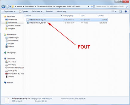 Hebt u beide bestanden in precies dezelfde map gezet, maar wordt er nog steeds niets weergegeven? Het kan natuurlijk liggen aan de instellingen van uw mediaspeler, maar voordat u die trukendoos opentrekt, is het verstandig om eerst te controleren of het videobestand en de ondertitel dezelfde naam hebben. Op de extensie na dienen deze bestandsnamen identiek te zijn om door de mediaspeler opgepikt te worden. Dus draagt uw filmbestand de naam independence_day.avi dan moet de ondertiteling independence_day.srt heten. Uiteraard zijn andere extensies ook mogelijk.