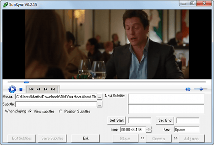 Ga terug naar het hoofdvenster van Subsync en klik op de knop Afspelen. Uw video begint nu te spelen en de ondertitel die u daaraan hebt gekoppeld wordt weergegeven. Bekijk het begin om te zien waar de allereerste ondertitel ongeveer zou moeten beginnen. Speel het stuk af en druk precies op dat moment op de knop Blue. Spoel naar het eind en klik op Green zodra de laatste ondertitel wordt weergegeven. Klik tot slot op Adjust en daarna op Save subtitles en u hebt de ondertitel gesynchroniseerd.