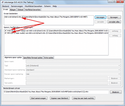 Klik op Toevoegen en blader naar het gewenste videobestand, herhaal dit voor het ondertitelbestand. Onder het kopje Sporen, hoofdstukken en markeringen worden nu drie bestanden weergegeven: voor video, voor audio en de ondertitels. Via de knop Bladeren kunt u eventueel een andere locatie opgeven. U kunt in dit programma nog veel meer instellen, maar in dit geval is dat helemaal niet nodig. Klik op Start samenvoegen. Het resultaat is een mkv-bestand dat zowel de video als de ondertitel bevat.