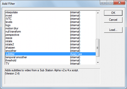 Voor het integreren van ondertitels hebt u twee verschillende programma's nodig: VirtualDub plus benodigd VirtualDub filter en Subtitle Workshop (welke u al hebt geïnstalleerd als u stap 10 t/m 12 moest uitvoeren). Downloadt VirtualDub en het filter via Virtualdub-Filters, klik op Download subtitler-2_4.zip from virtualdub.org. Pak het zipbestand uit, start VirtualDub en klik op Video / Filters / Add / Load. Blader naar het uitgepakte bestand Subtitler.vdf, dubbelklik erop en klik op OK. VirtualDub is nu gereed voor productie.