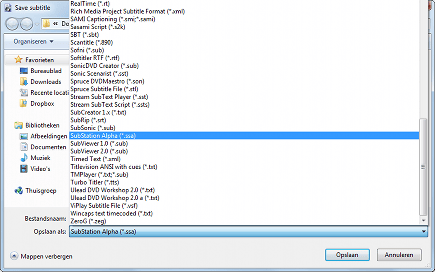 Voor het programma VirtualDub dienen uw ondertitels de extensie .ssa te hebben. Kunt u alleen ondertitels vinden met de extensie .srt? Geen zorgen, u kunt ze eenvoudig converteren met Subtitle Workshop. Klik op File / Load Subtitle en blader naar het ondertitelbestand. Eenmaal geopend klikt u wederom op File en daarna op Save as. In het menu dat verschijnt klikt u op het uitklapmenu naast Opslaan als: en kiest u voor SubStation Alpha (*.ssa). Klik op Opslaan. U hebt de ondertitel nu geconverteerd naar een bestandsformaat waarmee VirtualDub kan werken.