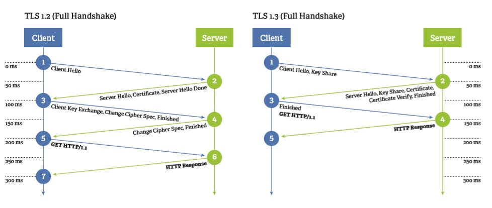 TLS 1.3 kort die verbindingsopbouw in tot één stap, waarin de client in één keer hallo zegt en vraagt om een sessiesleutel af te spreken, en de server geeft in die ene stap zijn certificaat terug en spreekt de sessiesleutel af, waarna de versleutelde verbinding kan beginnen.