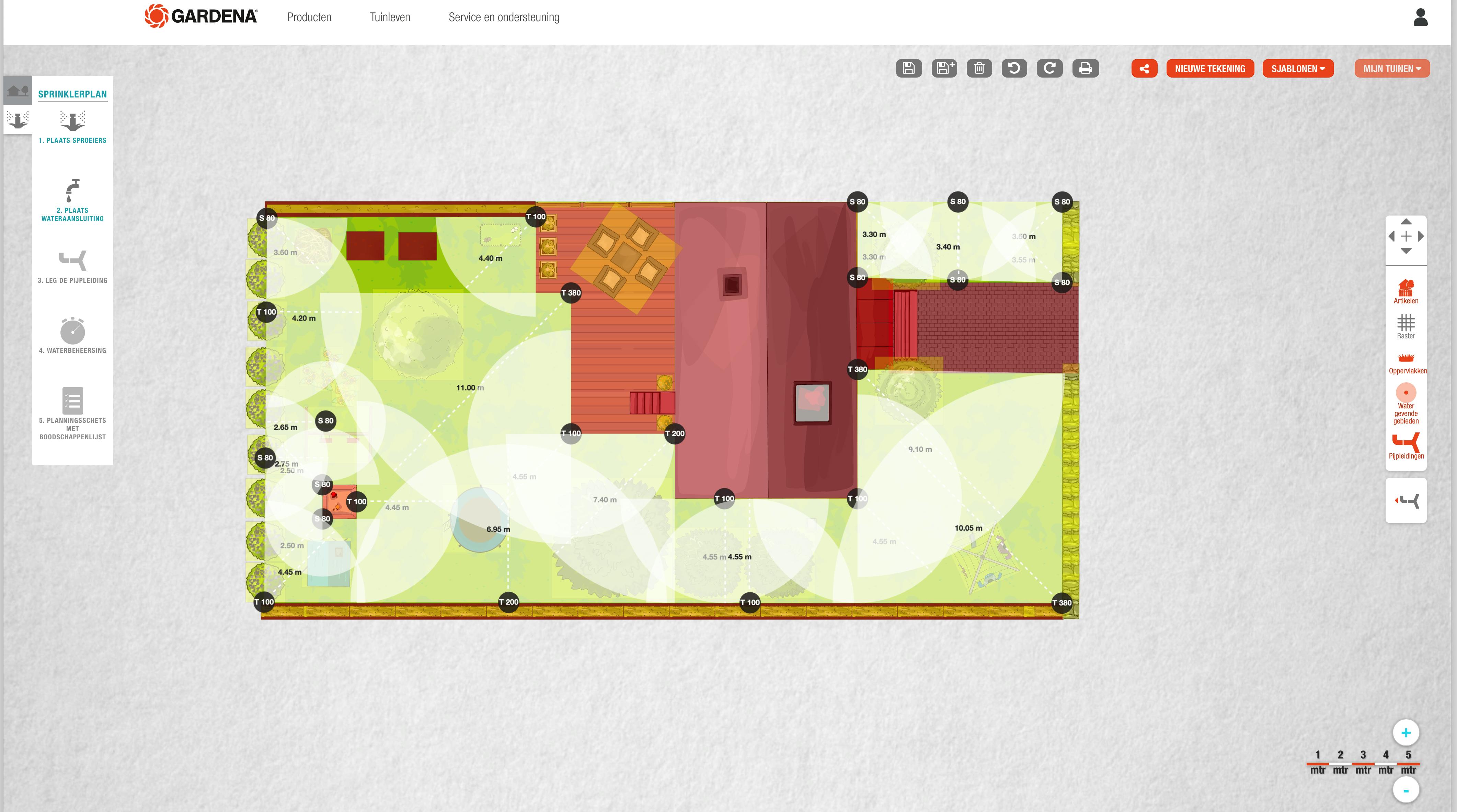 Eén van de meest bekende tuinmerken laat zijn ontwerptool volledig gratis gebruiken. Hier begin je met het tekenen van je droomtuin. Onder Perceel vind je alle soorten oppervlakken, zoals gazon, bloembedden en grindpaden. Daarnaast kun je heel veel objecten aan het ontwerp toevoegen door ze naar de gewenste plek te slepen. Klik je met de muis op een van de hoekpunten, dan kun je een object schalen. Om nauwkeurig te werken, zoom je in en uit via de plus- en minknop. Deze tool werkt met drie lagen die je afzonderlijk kunt tonen en verbergen: objecten, het raster (ieder vierkant is 1m2) en oppervlakken. Ieder ontwerp kun je afdrukken of opslaan. Wat Gardena My Garden uniek maakt ten opzichte van andere planners is dat je een slim sproeisysteem in je ontwerp kunt integreren. Wanneer je met het tuinontwerp klaar bent, navigeer je naar Sprinklerplan en Gardena berekent dan zelf waar en welke sproeiers je moet plaatsen. Je hoeft dus zelfs niets uit te rekenen, de tool zorgt dat de hele tuin de juiste bewatering krijgt.